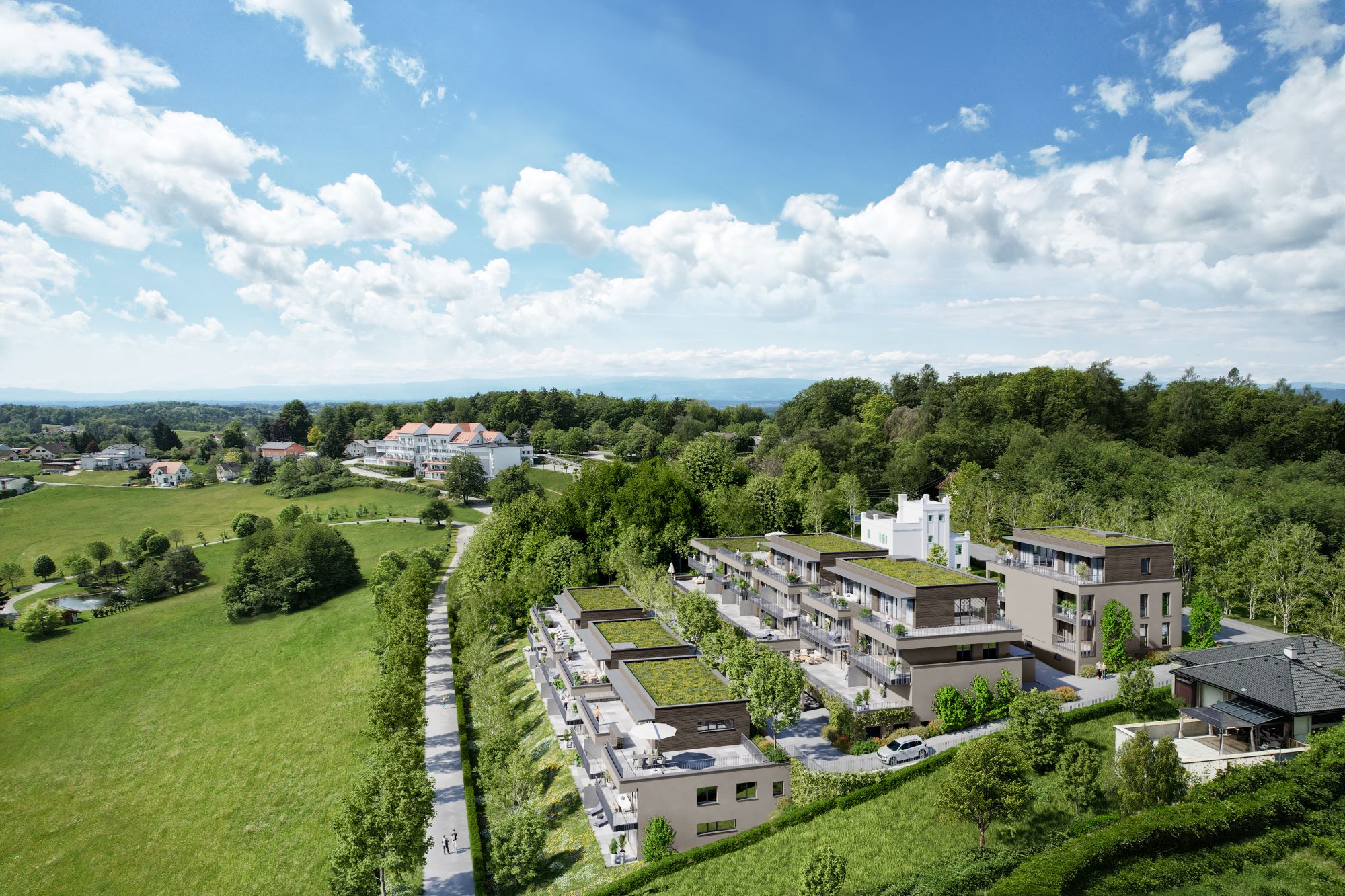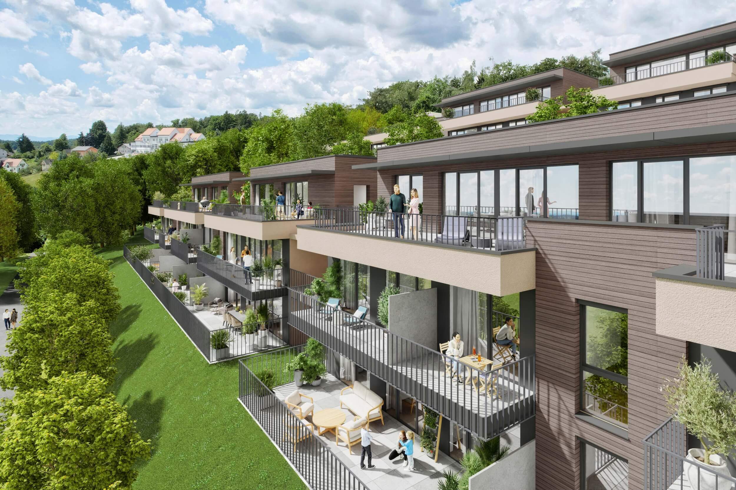 - Großzügige Außenflächen: Balkone, Terrassen und Eigengärten