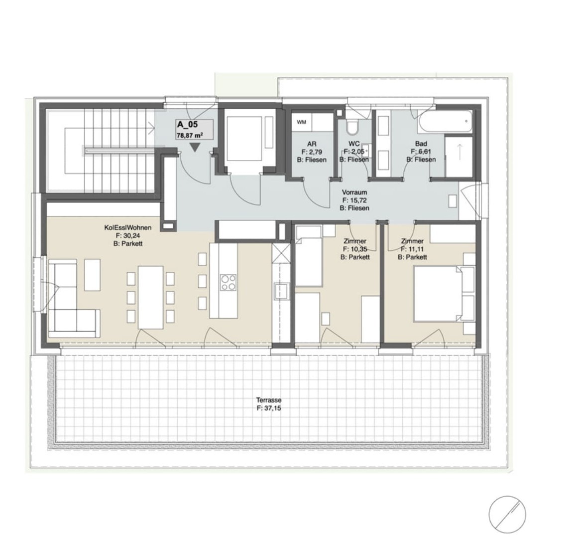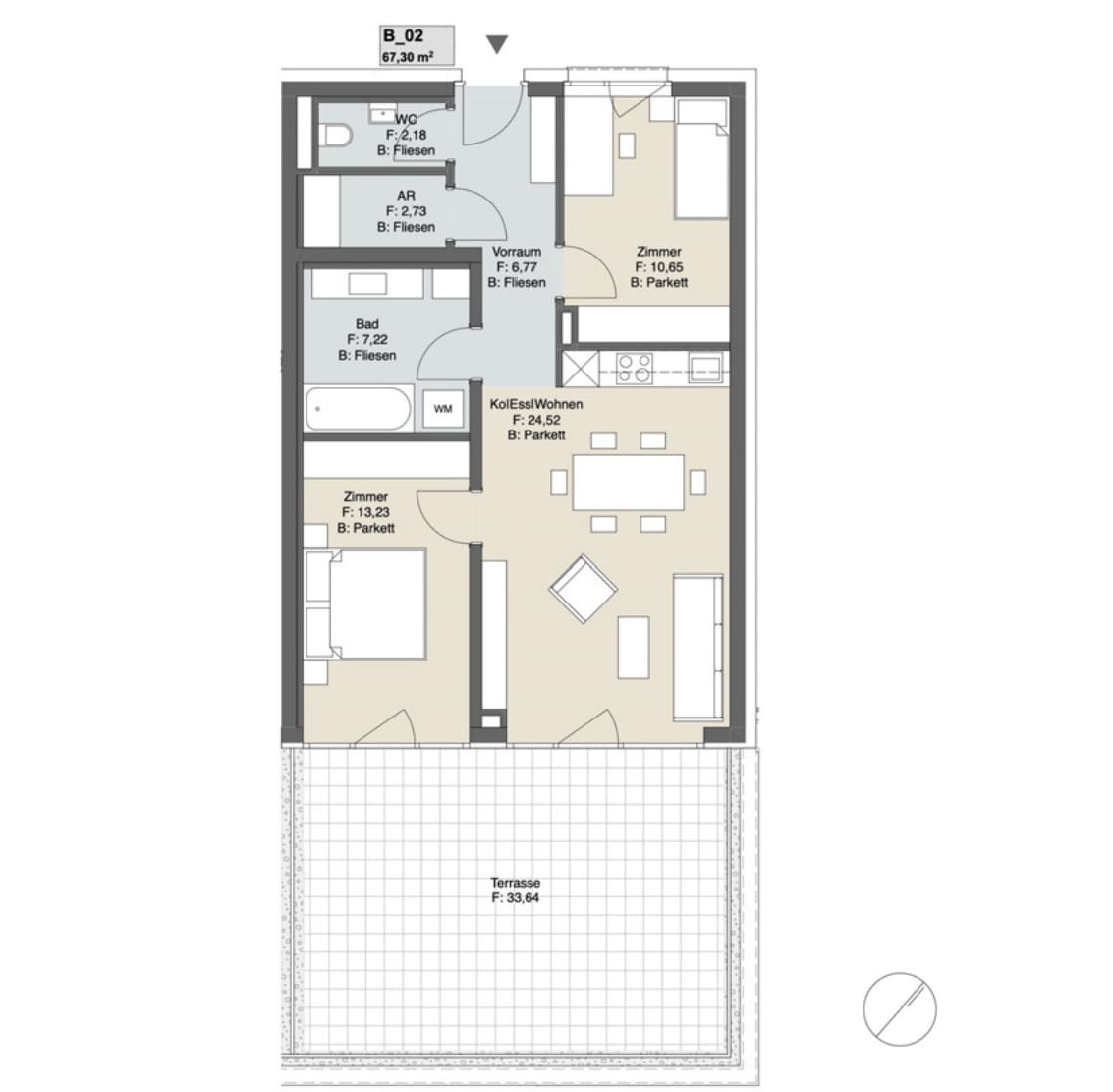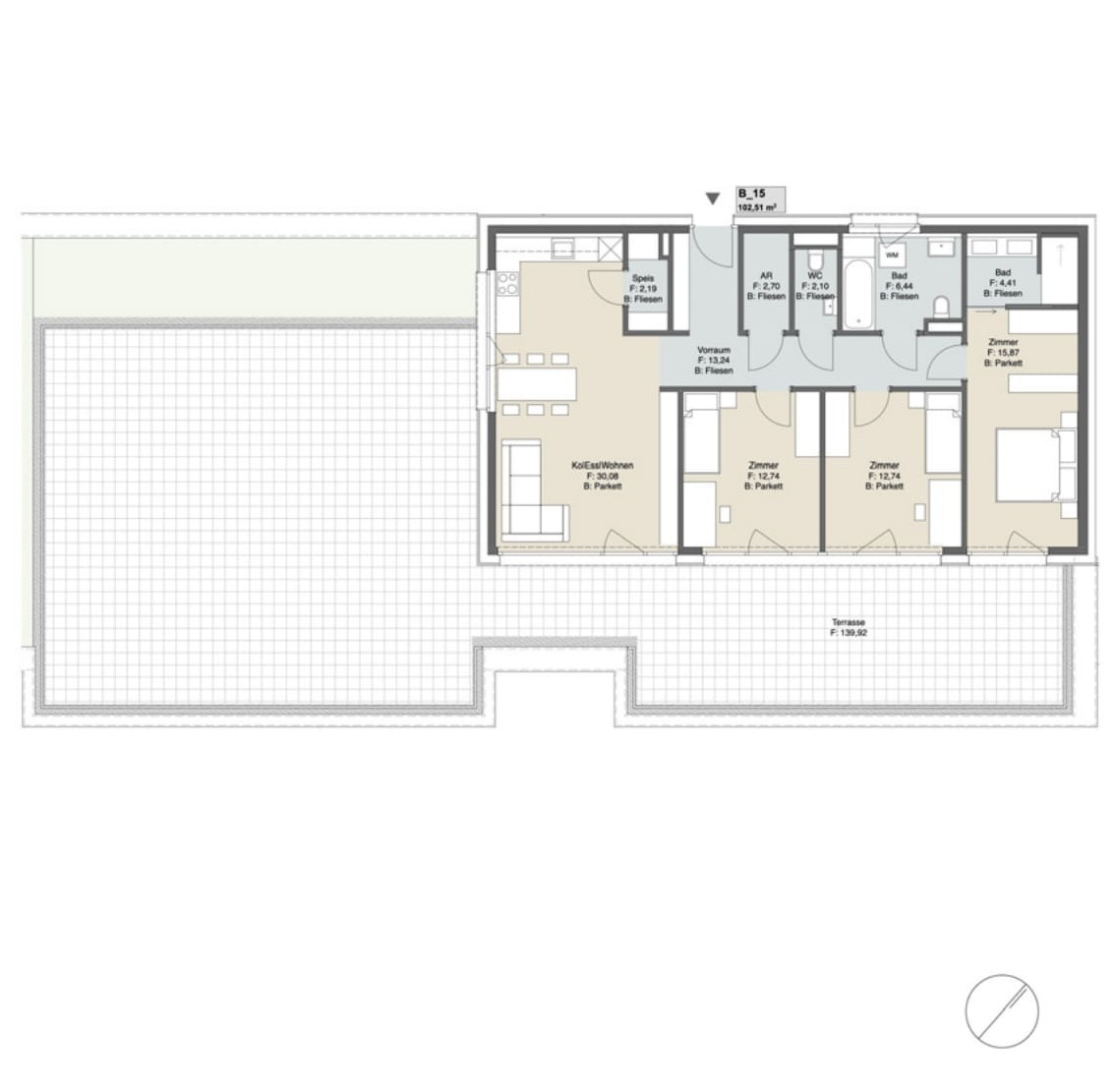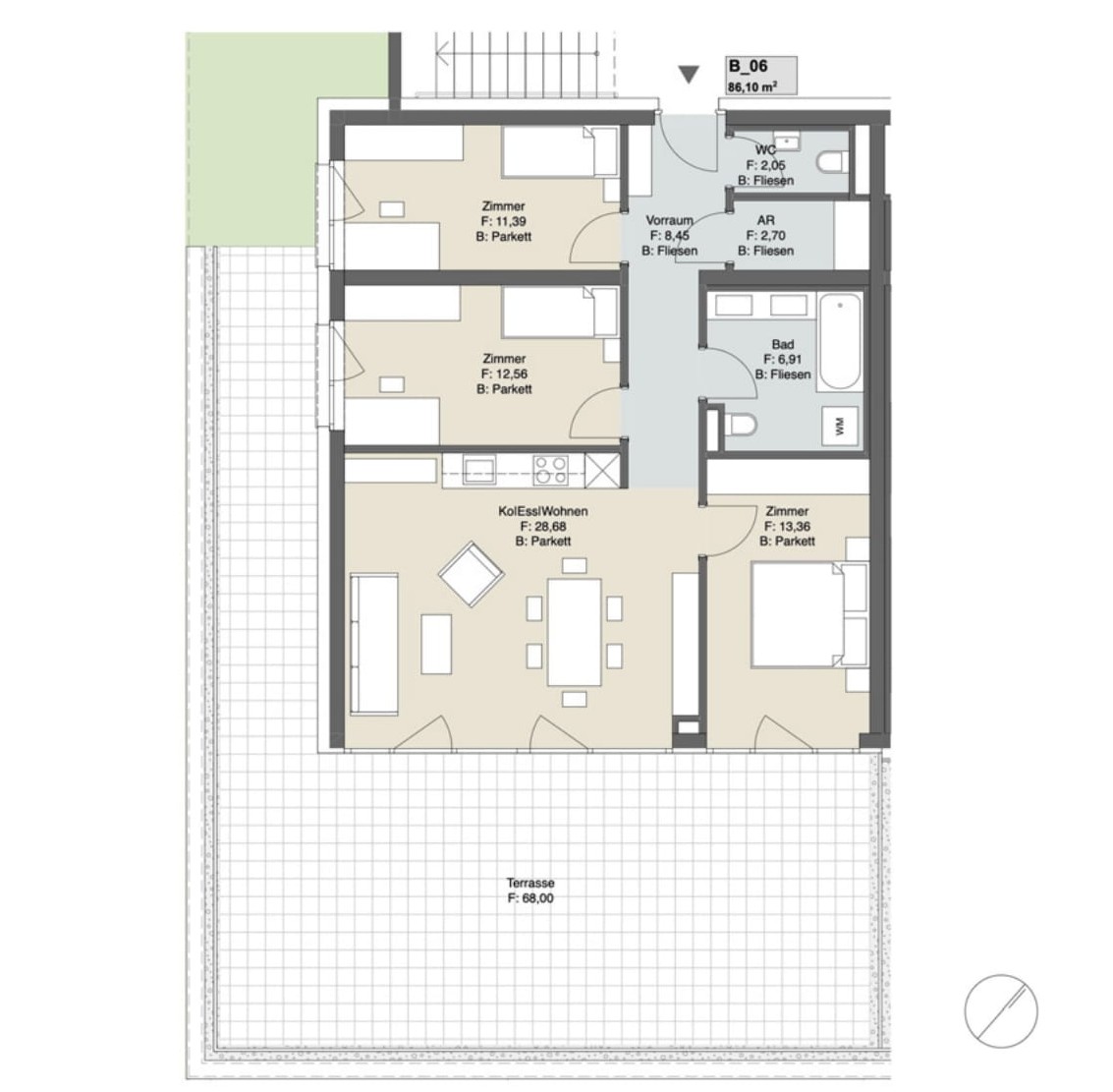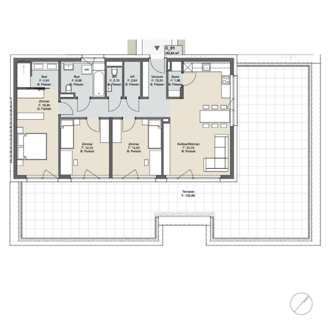 - Feinsteinzeug im Bad (60×60 cm Boden, 30×60 cm Wand) sowie 60×60 cm auf Balkonen/Terrassen