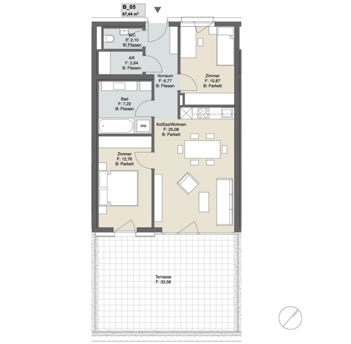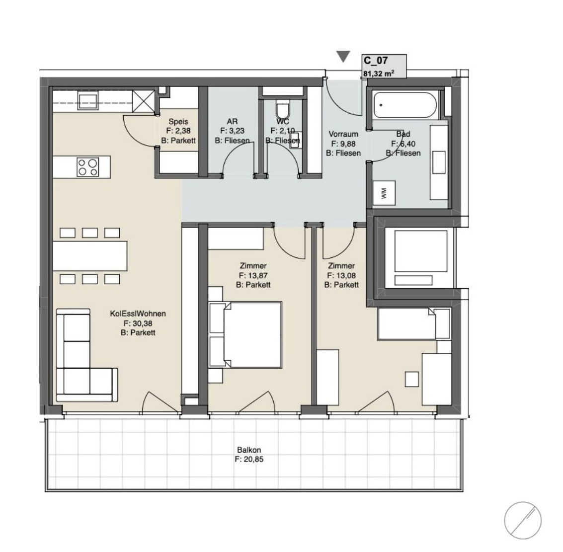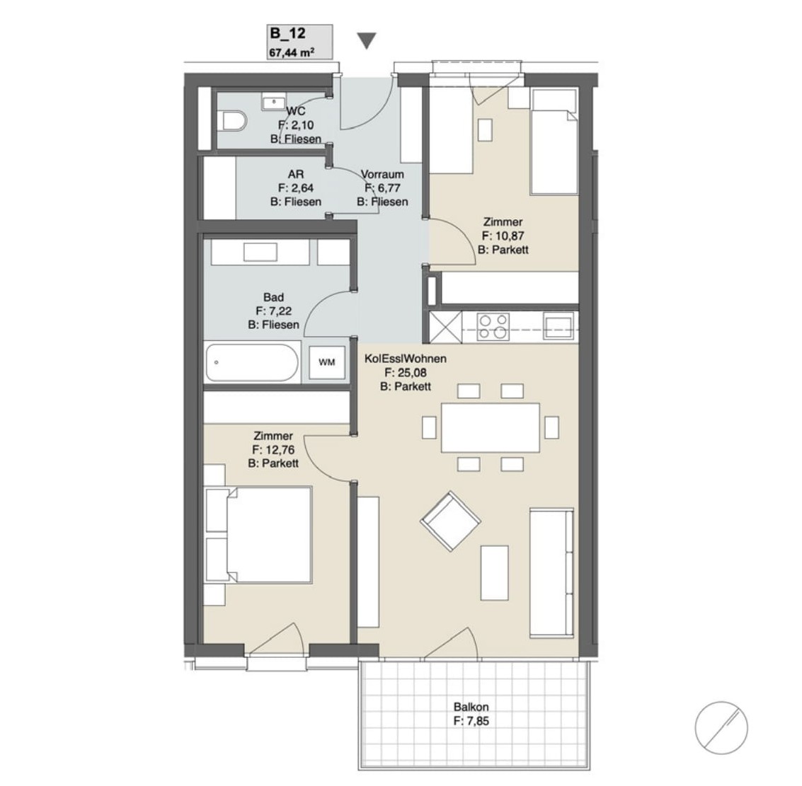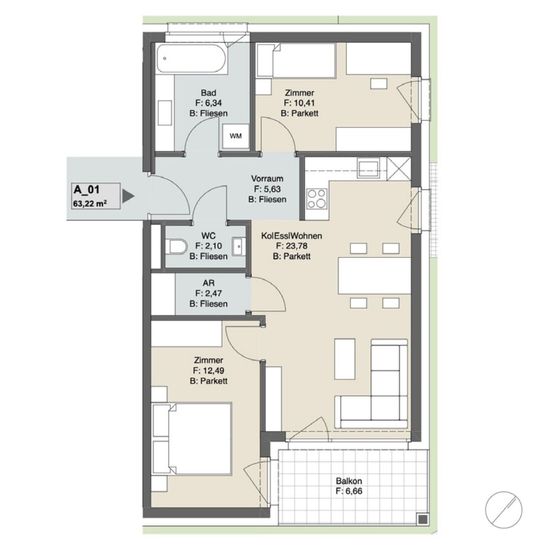- Feinsteinzeug im Bad (60×60 cm Boden, 30×60 cm Wand) sowie 60×60 cm auf Balkonen/Terrassen