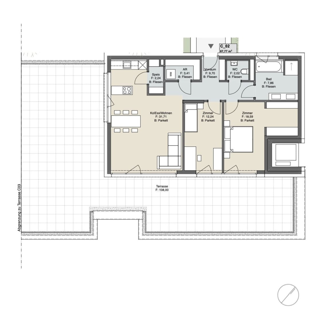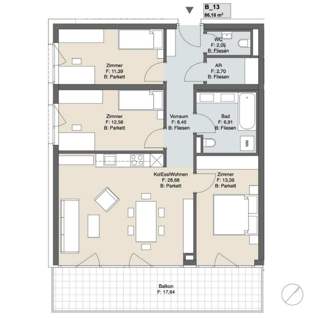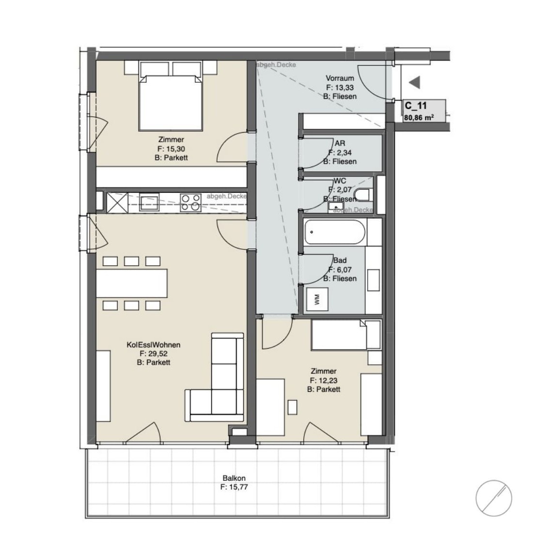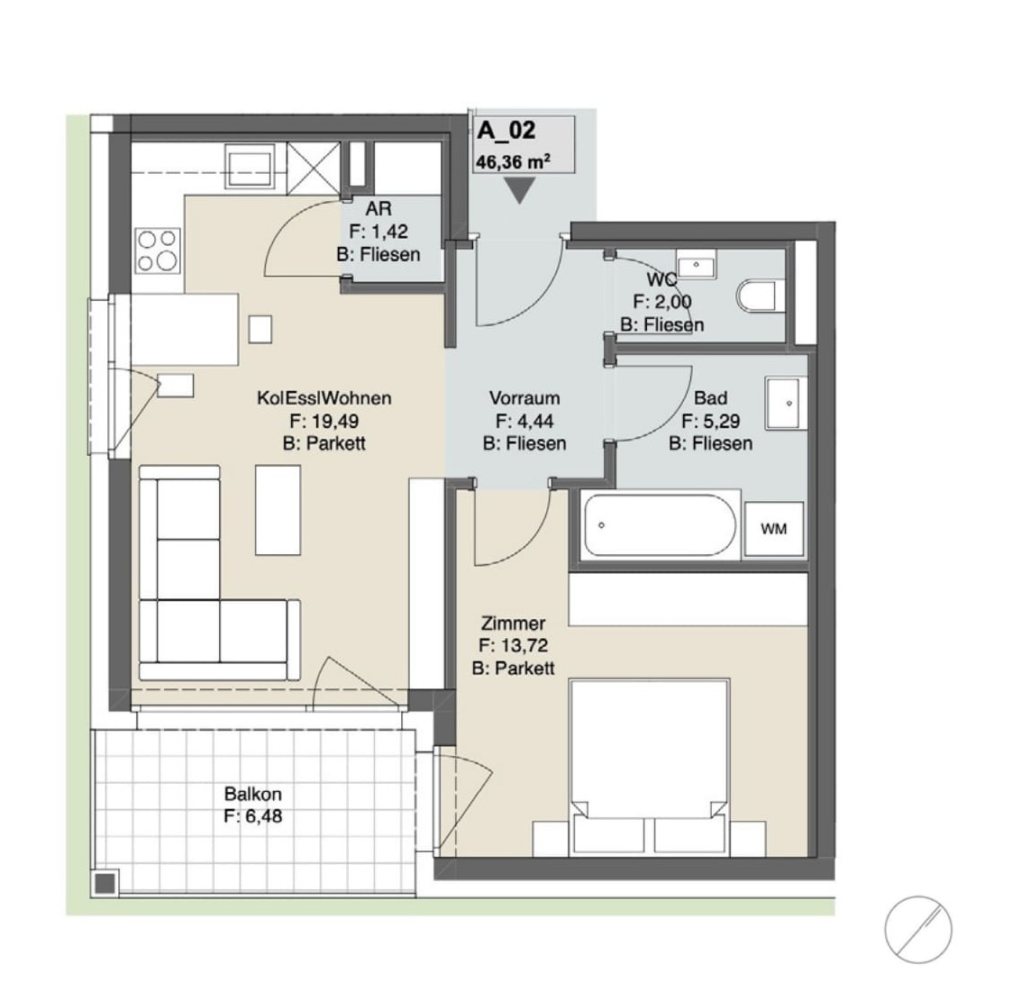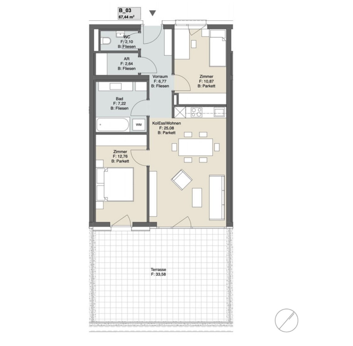 - Feinsteinzeug im Bad (60×60 cm Boden, 30×60 cm Wand) sowie 60×60 cm auf Balkonen/Terrassen