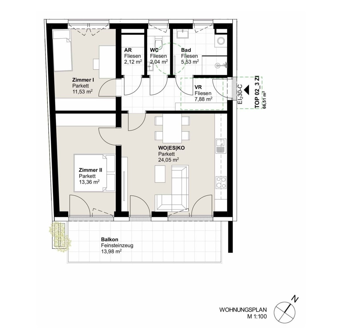 Einheit mit 3 Zimmern im 1. Geschoss. Ca. 66,51 m² Wohnfläche sowie Balkon (13,98 m²).