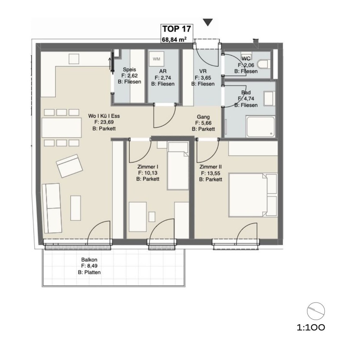 Einheit mit 3 Zimmern im 2. Geschoss. Ca. 68,84 m² Wohnfläche sowie Balkon (8,49 m²).
